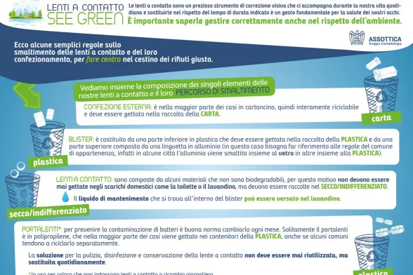 Infine, nel rispetto dell’ambiente, è importante smaltire correttamente i kit delle lenti a contatto, cioè, confezione esterna, blister, lenti, liquido di mantenimento, portalenti.