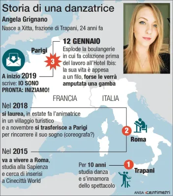 “Vogliamo che Angela Grignano continui a sognare. E' una ballerina e la danza è tutta la sua vita”. La famiglia della 24enne di Trapani, rimasta ferita il 12 gennaio in un'esplosione a Parigi, mentre lavorava all'hotel Ibis, ha già raccolto oltre 7mila dollari, circa 8mila euro, in meno di 24 ore dal lancio della raccolta fondi sulla piattaforma online GoFundMe. 'Dovete sapere alcune cose su Angela', scrivono i parenti, che 'si è avventurata da sola dalla Sicilia a Parigi, in Francia'. 'Ha vissuto in questo nuovo Paese solo pochi mesi, sperando di aprire nuove porte e realizzare il sogno di ballare in questa città famosa in tutto il mondo'.