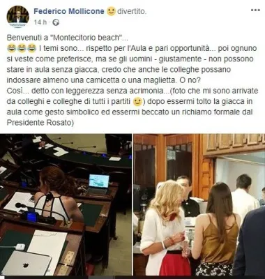 Foto che, scrive lo stesso deputato 'mi sono arrivate da colleghi e colleghe di tutti i partiti dopo essermi tolto la giacca in aula come gesto simbolico ed essermi beccato un richiamo formale dal Presidente Rosato'. Mollicone, infatti, si sarebbe tolto la giacca in Aula protestando contro le scollature delle onorevoli ma sarebbe stato subito richiamato dal vicepresidente della Camera, Ettore Rosato del Pd. Le immagini però in un secondo momento sono state rimosse dal post. Segno, forse, di un ripensamento non sappiamo se spontaneo o indotto.