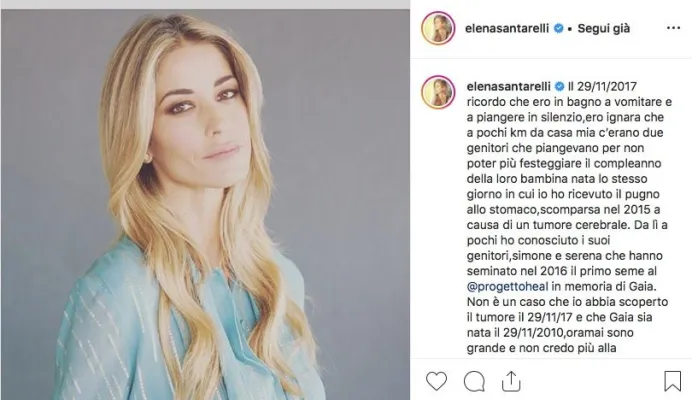 Elena Santarelli ha preannunciato la notizia con due lunghissimi post su Instagram nei quali ha condiviso soprattutto il senso di gratitudine per le tantissime persone che in questo anno e mezzo hanno aiutato lei, il suo bambino, il marito Bernardo Corradi e la sorellina di Giacomo, Greta, a combattere una battaglia terribile. “Quando vi ho resi partecipi del problema che ci ha colpiti ho anche promesso che quando sarebbe arrivata la tanto attesa comunicazione della fine delle cure l'avrei condivisa con tutti voi. Ecco quel giorno è arrivato: Giacomo finalmente è in “follow up'! Pochi giorni fa ha fatto la sua ultima terapia e i vari controlli hanno dimostrato che il nostro bellissimo bambino ha vinto questa battaglia. Oggi voglio testimoniare una storia a lieto fine per dare speranza a tante famiglie che ancora lottano o che si troveranno a lottare. Giacomo ha vinto la sua battaglia su un tumore cerebrale maligno e solo ora voglio condividere questo particolare, sperando possa infondere positività a molte famiglie, ma ricordando che ogni bambino ha la sua storia e il suo percorso. Quando si affronta un percorso così a volte non respiri dopo aver sentito altre storie. Il mio consiglio è quello di vivere la propria storia senza fare troppi confronti, affidandosi ai medici che hanno in cura i nostri bambini”.