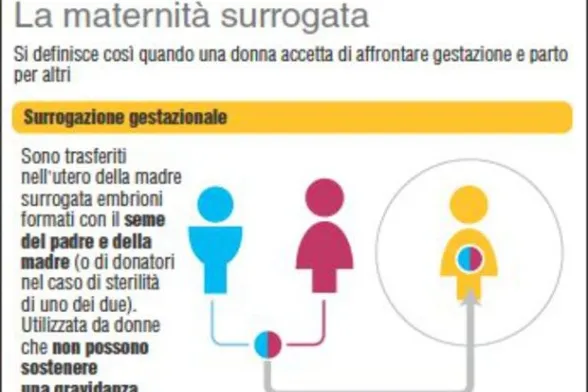La maternità surrogata si ha quando una donna si rende disponibile a portare a termine un'intera gravidanza, fino al parto, su commissione di single o coppie incapaci di generare o concepire un bambino. La surrogazione di maternità, o gestazione per altri, talvolta denominata utero in affitto, è possibile grazie alla fecondazione in vitro. Si realizza quando una donna (madre portante) assuma l'obbligo di provvedere alla gestazione e al parto per conto di una singola persona o una coppia (eterosessuale o omosessuale), alla quale si impegna a consegnare il nascituro. La fecondazione può essere effettuata con seme e ovuli sia della coppia sterile sia di donatori e donatrici attraverso concepimento in vitro.