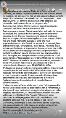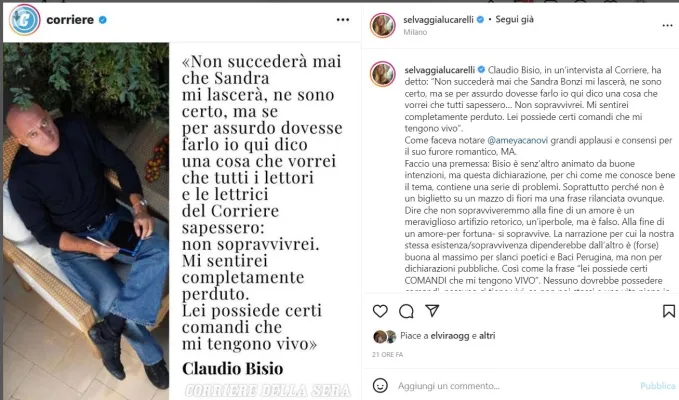 Poco importa che Bisio sia un attore comico e che tutta la doppia intervista sia scritta sulla falsariga del gioco, dello scherzo, dell'ironia, dell’iperbole. Tra le altre cose, ad esempio, Bisio racconta di essersi definitivamente innamorato di Sandra Bonzi quando gli ha vomitato in macchina, ma non è necessario credergli alla lettera. D’altro canto, anche la moglie afferma di essersi decisa a pubblicare il romanzo perché convinta da lui, il che potrebbe lasciar intravvedere qualche altra forma virale di dipendenza affettiva, anziché la fiducia e la stima nel proprio compagno. Insomma, in un lungo post la Lucarelli attacca Bisio così: “La narrazione per cui la nostra stessa esistenza/sopravvivenza dipenderebbe dall’altro è (forse) buona al massimo per slanci poetici e Baci Perugina, ma non per dichiarazioni pubbliche”. E ancora: “L’idea che senza l’altro si sia morti, che l’altro governi la nostra vita e che se ne sia dipendenti non è romantica. E’ alla base di quei pericolosi retaggi culturali per cui, nella migliore delle ipotesi, si rimane impantanati in relazioni velenose e svilenti perché “senza l’altro non sono nessuno” e nella peggiore “ti uccido perché non puoi esistere senza di me, io devo essere il tuo tutto”.