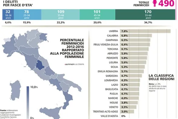 Da questi dati risulta che in Italia calano gli omicidi volontari, del 39% nei sei anni che vanno dal 2011 al 2016, ma non calano invece gli omicidi con vittime di sesso femminile: negli ultimi quattro anni restano stabili e rappresentano circa un quarto degli omicidi complessivamente commessi, spiega la Commissione. Quindi, come ha sottolineato il comandante dell’Arma dei Carabinieri, generale Tullio Del Sette, durante la sua audizione, c’è stato «un innalzamento in termini relativi del numero di omicidi con vittime di sesso femminile rispetto al numero degli omicidi degli individui di sesso maschile».