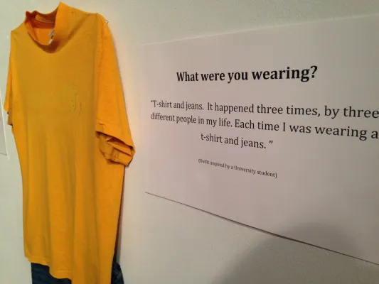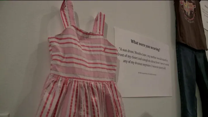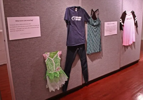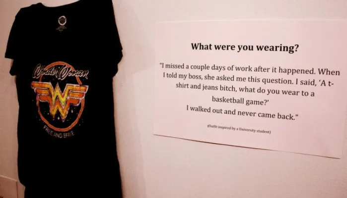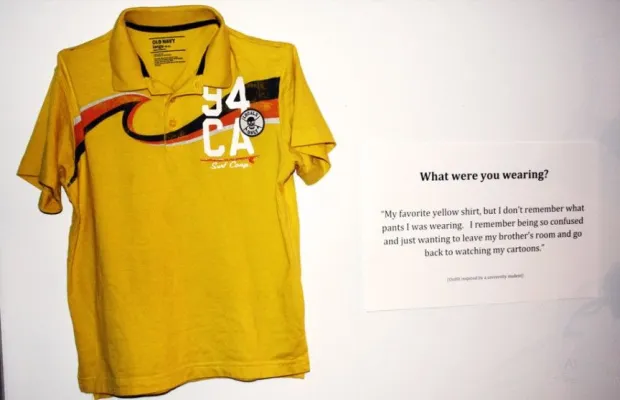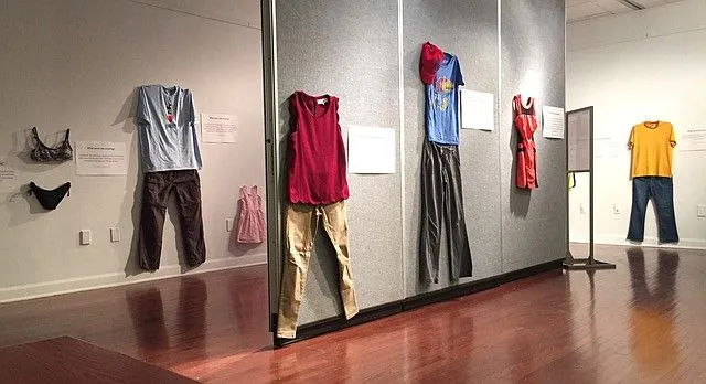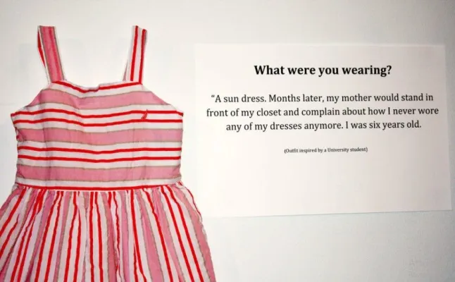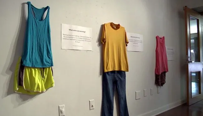 Si tratta di 18 vestiti, esposti ognuno accanto a un pannello con una storia (vera) di poche righe raccontata da una donna che ha subito abusi sessuali e che indossava un vestito proprio simile a quello quand’è successo. La mostra, voluta dalla direttrice dell’Istituto universitario per la prevenzione e l’educazione sessuale Jen Brockman, è fatta di pantaloni, maglioni, vestiti, magliette di uso comune. Non sono i «reperti» dei casi di violenze indossati davvero dalle vittime, li hanno portati gli studenti sulla base dei racconti raccolti, in alcuni casi, parlando direttamente con le vittime.