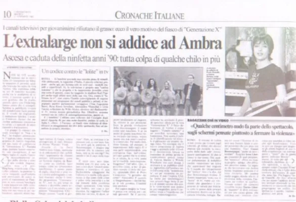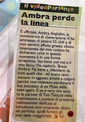 Si sente un voiceover di un servizio televisivo che dice: “Liberata dal fastidioso fardello di ciccia che aveva fatto impensierire tutti i suoi ammiratori”, mentre la telecamera stringe sul fondoschiena di una ragazza minorenne. E ancora: “Nemmeno l’abito nero e la gonna lunga riescono a dissimulare i chili di troppo”, queste le parole di una didascalia sotto una foto di giornale. Poi: “Aiuto, sto diventando un palloncino gonfiato”, recitava il titolo a tutta pagina di una rivista, o ancora: “L’extralarge non si addice ad Ambra Angiolini” si leggeva su un quotidiano.