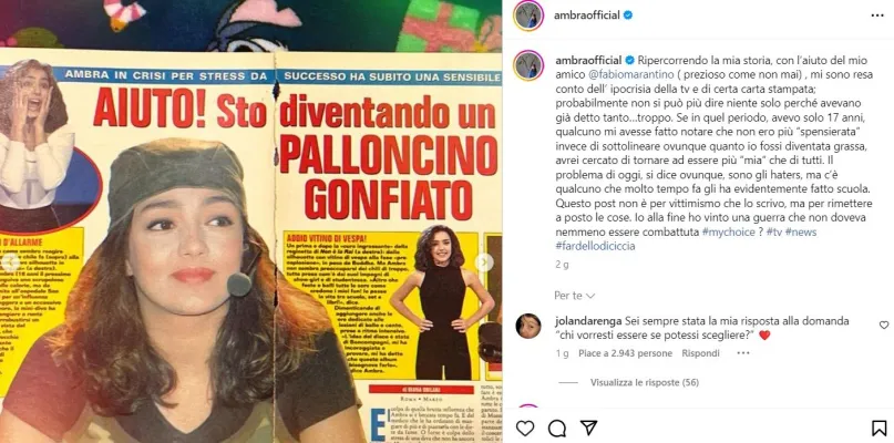 Nella didascalia a corredo del post di Instagram con cui Ambra Angiolini ha pubblicato un video che ripropone clip e immagini degli anni Novanta si legge: “Ripercorrendo la mia storia, con l’aiuto del mio amico Fabio Marantino (prezioso come non mai), mi sono resa conto dell’ipocrisia della tv e di certa carta stampata; probabilmente non si può più dire niente solo perché avevano già detto tanto…troppo. Se in quel periodo, avevo solo 17 anni, qualcuno mi avesse fatto notare che non ero più ‘spensierata’ invece di sottolineare ovunque quanto io fossi diventata grassa, avrei cercato di tornare ad essere più ‘mia’ che di tutti. Il problema di oggi, si dice ovunque, sono gli haters, ma c’è qualcuno che molto tempo fa gli ha evidentemente fatto scuola. Questo post non è per vittimismo che lo scrivo, ma per rimettere a posto le cose. Io alla fine ho vinto una guerra che non doveva nemmeno essere combattuta”.