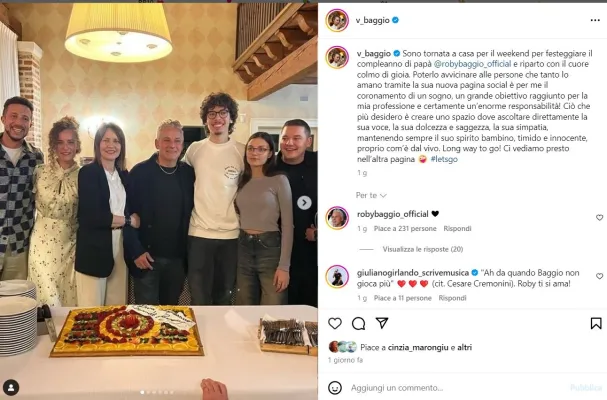 Baggio ha compiuto nei giorni scorsi 57 anni e la figlia gli regalato una pagina Instagram @robybaggio_official che in pochissime ore ha già raggiunto decine di migliaia di follower, con la dedica: Ciao a tutti! In occasione del compleanno del mio papà oggi abbiamo creato la sua UNICA pagina social UFFICIALE. Poi l'invito «Seguitela e smettete di seguire ogni altro fake. Grazie infinite!». Nella sua pagina personale poi ha documentato i festeggiamento: "Come da tradizione anche quest’anno il mio momento “cori da stadio” per il mio mitico papà, con tanto di fumogeni! Tanti auguri al mio migliore amico, il mio super papà, il mio campione, l’uomo con gli occhi più belli del mondo che racchiudono tanta dolcezza saggezza e timidezza. Con tutto l’amore del mondo! Ormai le prove generali le ho fatte, l’anno prossimo conduttrice tv". L'anno scorso invece la dedica commovente: "A te che mi hai insegnato a pensare, fare e sentire tutto con il cuore. A te che sei il mio migliore amico e la persona con cui più volentieri passo il mio tempo, che sia in silenzio o per giocare a carte. A te che sei un tesoro prezioso e ogni istante con te è impagabile".