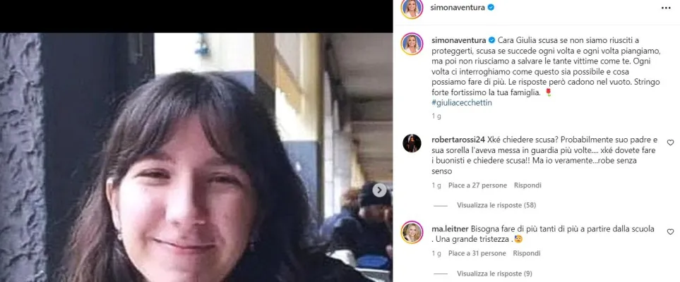 Con un tweet su X, Simona Ventura ha chiesto scusa alla ragazza: "Cara Giulia scusa se non siamo riusciti a proteggerti, scusa se succede ogni volta e ogni volta piangiamo, ma poi non riusciamo a salvare le tante vittime come te. Ogni volta ci interroghiamo come questo sia possibile e cosa possiamo fare di più. Le risposte però cadono nel vuoto. Stringo forte fortissimo la tua famiglia.