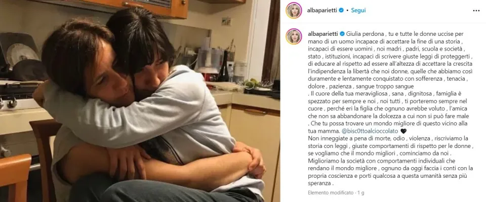 Al coro di indignazione si unisce anche Alba Parietti su Instagram: "Giulia perdona, tu e tutte le donne uccise per mano di un uomo incapace di accettare la fine di una storia, incapaci di essere uomini, noi madri, padri, scuola e società, stato, istituzioni, incapaci di scrivere giuste leggi di proteggerti, di educare al rispetto ad essere all’altezza di accettare la crescita l’indipendenza la libertà che noi donne, quelle che abbiamo così duramente e lentamente conquistato con sofferenza, tenacia, dolore, pazienza, sangue troppo sangue. Il cuore della tua meravigliosa, sana, dignitosa, famiglia è spezzato per sempre e noi, noi tutti, ti porteremo sempre nel cuore, perché eri la figlia che ognuno avrebbe voluto, l’amica che non sa abbandonare la dolcezza a cui non si può fare male. Che tu possa trovare un mondo migliore di questo vicino alla tua mamma. Non inneggiate a pena di morte, odio, violenza, riscriviamo la storia con leggi, giuste comportamenti di rispetto per le donne, se vogliamo che il mondo migliori, cominciamo da noi. Miglioriamo la società con comportamenti individuali che rendano il mondo migliore, ognuno da oggi faccia i conti con la propria coscienza e porti qualcosa a questa umanità senza più speranza".
