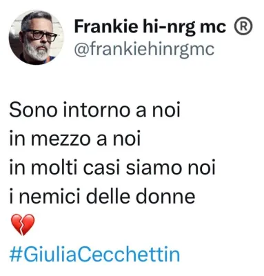 Bello il post su Instagram di Frankie hi-nrg: "Basta pubblicare e mostrare foto in cui la vittima e l'assassino appaiono come innamorati. Basta normalizzare l'abnorme. Basta reiterare i concetti "chi lo avrebbe mai detto", "sembra tanto un bravo ragazzo", "l'amava troppo". Basta, per Giulia, per le altre, per tutti.