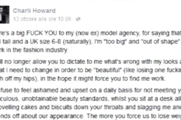 Modella, scrittrice, femminista - Così si definisce sui suoi profili social Charlie Howard, 23 enne modella britannica. Nel suo sfogo ha ribadito: "Mi rifiuto di sentirmi in colpa perché non raggiungo i vostri ridicoli e impossibili standard di bellezza mentre state seduti tutto il giorno alla scrivania, divorando torte e biscotti e criticando me e le mie amiche per il nostro aspetto fisico". Quei tre centimetri di troppo sui fianchi, nonostante la taglia 38, resteranno lì. Pazienza se Charli dovrà cambiare agenzia o lavoro: "Piu' ci costringete a perdere peso, più gli stilisti realizzeranno vestiti che si adattino alle vostre misure, e più le giovani ragazze si ammaleranno. Non è più un’immagine che voglio rappresentare. Ho combattuto la natura a lungo, ma ora amo le mie forme. La mia salute mentale e fisica è più importante di un numero".