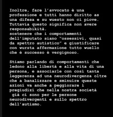 Per la sorella di Giulia, "ciò che è successo non sparisce solo perché un'aggravante non viene contestata, o più di una". Elena ritorna così sulla questione dello stalking, non ritenuto una aggravante per i giudici. Per lei è "una mancanza di rispetto anche alla famiglia della vittima". Poi prosegue: "il non riconoscimento dello stalking, (non parlo nemmeno dell'altra aggravante perché la situazione si commenta da sola) è un'ennesima conferma che alle istituzioni non importa nulla delle donne". Per la sorella di Giulia "sei vittima solo se sei morta, Quello che subisci in vita te lo gestisci da sola. Quante donne non potranno mettersi in salvo dal loro aguzzino se nemmeno nei casi più palesi non viene riconosciuta una colpa?". Però invece di stalking si parla sempre "con le frasi melense il 25 novembre e per i dépliant ".