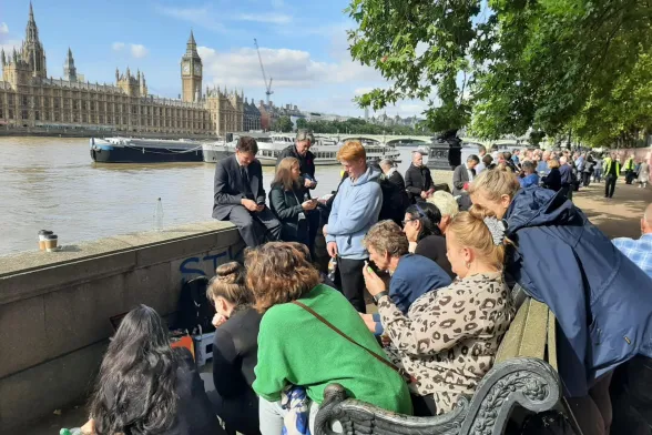 Tutti con gli occhi puntati sui telefonini lungo la fila mentre passa Elisabetta. Si creano capannelli attorno ai dispositivi che prendono meglio il segnale, visto che le reti sono sovraccariche a causa delle migliaia di cellulari attivi in zona. Si indicano, riconoscendoli, i membri della famiglia reale. Un momento di condivisione che vede insieme chi è in coda da ore, i volontari, le forze dell'ordine.