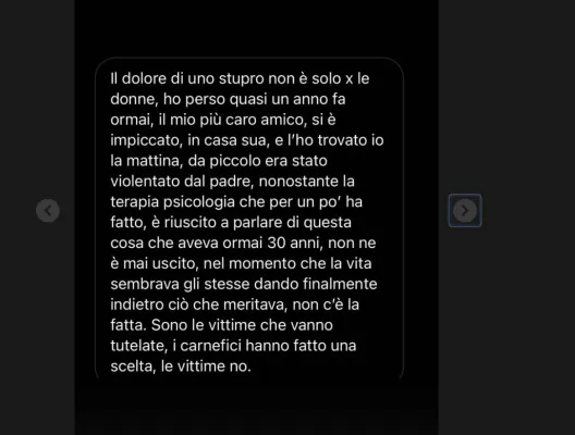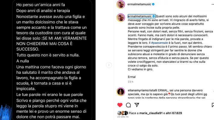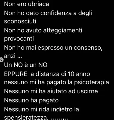 Tra i commenti, anche quello dell'attrice Elena Sofia Ricci: "La tua anima bella non può essere fraintesa. A 12 anni tentai di proteggermi con un disegno che avevo fatto...un foglio di carta colorato, dall'abuso di un signore molto grande e molto stimato che conosceva bene la mia famiglia. Ho potuto parlarne solo pochi anni fa. Segni che restano per sempre". E le parole di Ermal Meta per una volta non meritano repliche: "Quando stupri una donna uccidi il suo futuro, la sua fiducia nel prossimo e nella vita e senza quella fiducia comprometti la sua capacità un domani persino di avere dei figli. Questo compromette l'umanità intera. Lo stupro è un crimine contro l'umanità. Quale è la pena proporzionale per una cosa del genere? Mi sembra che servano leggi stringenti per far sentire le donne che subiscono abusi e molestie in grado di denunciare senza alcuna remora, senza sfiducia e senza paura. Se per questo volete crocifiggermi, non stancatevi a tirarmi su che sulla croce ci salgo da solo". Poi, certo, non bisogna dimenticarsi della rieducazione dei carnefici, di offrire loro la possibilità di redimersi, di migliorare l’educazione, la scuola. La cultura. Ma per una volta mettiamoci nei panni della vittima, panni che difficilmente riusciremmo a toglierci di dosso per il resto della vita.