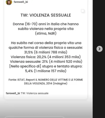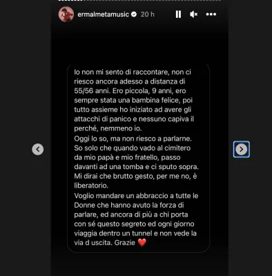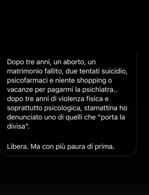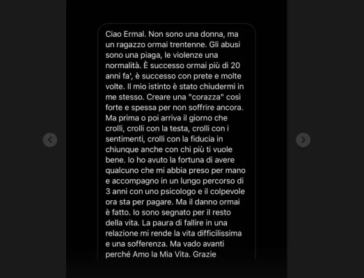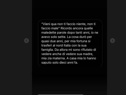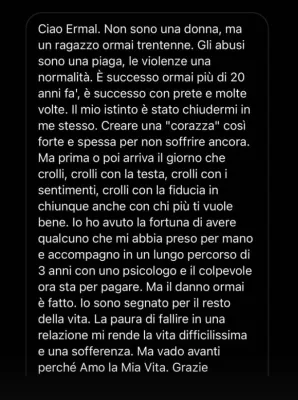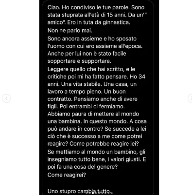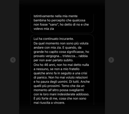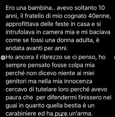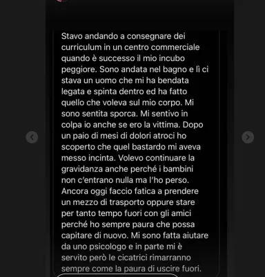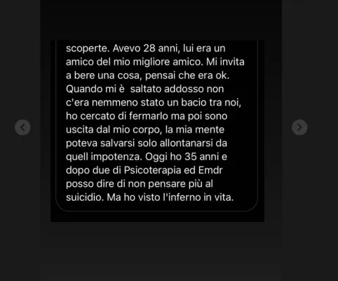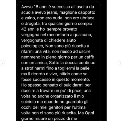 “Sono stata stuprata a 15 anni da un “amico”. Ero in tuta da ginnastica. Non ne parlo mai": è l'inizio di una delle testimonianze di vittime di violenza sessuale. Tante, tantissime le storie, tutte anonime. "Caro Ermal, sono stata stuprata il 26 dicembre del 2000...dopo 23 anni non riesco ancora a confessarlo a mio marito, provo vergogna". Una donna, stuprata dallo zio a 5 anni, confessa che "vorrei dire a quelle persone che parlano, parlano, parlano che vivere con un trauma così non è facile, lavarti fino a farti uscire il sangue dalla pelle perché ti senti sporca è un orrore". E poi la straziante testimonianza di una donna, che racconta della sua amica che, nonostante un marito e una figlia amatissimi, non ce l'ha fatta più a sostenere l'enorme dolore che lascia uno stupro e una mattina, dopo aver portato la bimba a scuola, è tornata a casa e si è impiccata.