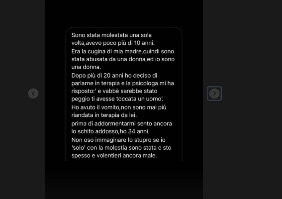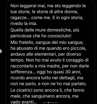 Oppure: “In ogni storia rivedo la mia. Quella delle mura domestiche più pericolose che ho conosciuto. Mio fratello, sangue del mio sangue, ha abusato di me quando ero piccola, per diverso tempo. Non ho mai avuto il coraggio di raccontarlo a mia madre per non darle sofferenze. Oggi ho quasi 30 anni, ricordo tutto nei dettagli ma non ne parlo, non ne ho mai parlato. Le cicatrici sono ancora lì che fanno male, che sanguinano”. Eccone un’altra: “Oltre agli abusi io ero diventata il suo posacenere personale. O meglio le mie braccia lo erano. Ho ancora i segni indelebili”. E via ancora in una discesa agli inferi che sembra non conoscere il fondo. C’è chi racconta lo stupro subito mentre era incinta, chi svela di soffrire di attacchi di panico e di disturbi alimentari, chi è terrorizzata dal mettere al mondo dei figli perché ha paura che possa nascere una bimba e soffrire ciò che ha sofferto lei. Il campionario degli orrori è vastissimo.