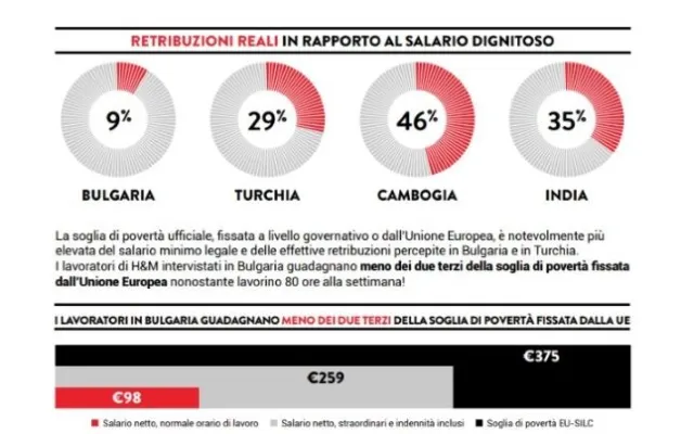 Secondo la ricerca, i lavoratori intervistati guadagnano in India e Turchia un terzo e in Cambogia meno della metà della soglia stimata di salario dignitoso. In Bulgaria, lo stipendio dei lavoratori intervistati presso i fornitori di H&M non arriva nemmeno al 10% del necessario per condurre una vita quantomeno dignitosa.
