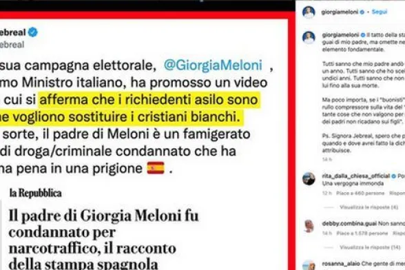 In pratica quest’ultima ha scritto un messaggio sui social in cui, sull’onda di quanto pubblicato da certa stampa spagnola, dice testualmente: “Durante la sua campagna elettorale, Giorgia Meloni, il nuovo Primo Ministro italiano, ha promosso un video di stupro in cui si afferma che i richiedenti asilo sono criminali che vogliono sostituire i cristiani bianchi. Ironia della sorte, il padre di Meloni è un famigerato trafficante di droga/criminale condannato che ha scontato una pena in una prigione”.