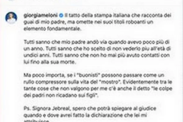 La risposta della premier in pectore – come riporta AdnKronos - non si è fatta attendere: 'Il tatto della stampa italiana che racconta dei guai di mio padre, ma omette nei suoi titoli roboanti un elemento fondamentale – scrive la leader di Fratelli d'Italia - Tutti sanno che mio padre andò via quando avevo poco più di un anno. Tutti sanno che ho scelto di non vederlo più all'età di undici anni. Tutti sanno che non ho mai più avuto contatti con lui fino alla sua morte. Ma poco importa, se i 'buonisti' possono passare come un rullo compressore sulla vita del 'mostro'. Evidentemente tra le tante cose che non valgono per me c'è anche il detto 'le colpe dei padri non ricadano sui figli. Ps. Signora Jebreal, spero che potrà spiegare al giudice quando e dove avrei fatto la dichiarazione che lei mi attribuisce', aggiunge Giorgia Meloni riferendosi ad affermazioni attribuitele dalla giornalista sui richiedenti asilo.