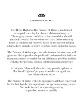 Si è parlato di un tumore ma era stato negato dal Palazzo, diastasi addominale, isterectomia, appendicite, calcoli e diverticolite, questi ultimi al momento i più plausibili (per approfondire leggete qui). Alcune fonti hanno rivelato che il Principe di Galles tornerà al lavoro "una volta che le cure e il recupero della Principessa di Galles saranno sistemati".