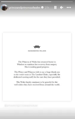 "La Principessa del Galles è tornata a casa a Windsor per continuare il suo recupero dall'intervento. Sta facendo buoni progressi. Il Principe e la Principessa desiderano ringraziare enormemente l'intero team della London Clinic, in particolare il personale infermieristico dedicato, per le cure che hanno fornito. La famiglia Wales continua a essere grata per gli auguri che ha ricevuto da tutto il mondo" si legge nella nota ufficiale diffusa da Kensington Palace. Il ritorno agli impegni di Palazzo "dipenderà dal parere dei medici". Kate Middleton 13 giorni fa era stata ricoverata alla London Clinic a causa di un intervento all'addome la cui natura non è stata rivelata. La consorte dell'erede al trono britannico William, ora dovrà trascorrere circa tre mesi di convalescenza a riposo nell'Adelaide Cottage dove vive con la famiglia. Annullati fino a Pasqua gli impegni della coppia reale.