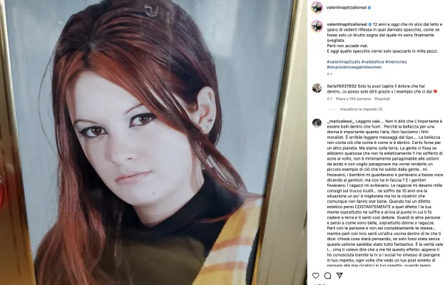 La sua storia riporta alla mente quella della sarda Valentina Pitzalis, il cui volto fu sfregiato crudelmente dal marito che glielo bruciò col fuoco dopo averla cosparsa di kerosene. Il marito morì tra le fiamme e lei, orrendamente sfigurata, ha oggi il coraggio di dire “lo perdono”. Valentina oggi scrive su Instagram: "Due anni a oggi che mi alzo dal letto e spero di vederti riflessa in quel dannato specchio, come se fosse solo un brutto sogno dal quale mi sono finalmente svegliata. Però non accade mai. E oggi quello specchio vorrei solo spaccarlo in mille pezzi". Insomma quando Valentina si guarda allo specchio sogna di rivedere l'immagine riflessa di come era prima. La “pelle vellutata, le labbra imbronciate, le sopracciglia arcuate, il naso piccolo e sottile”. Poi l’amara realtà. Quella che l’atto di crudeltà e violenza ha lasciato del suo viso.