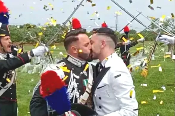Cerimonia in alta uniforme e con picchetto d’onore per lo sposalizio di Angelo e Giuseppe in una masseria pugliese. Originari di Brindisi, uno carabiniere appuntato scelto a Palazzo Chigi (Angelo), l’altro parrucchiere, hanno pronunciato il “Sì” coniugale circondati da amici e parenti dopo quattro anni di convivenza a Roma.