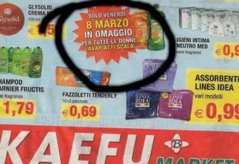 Il secondo posto spetta senza dubbio all’ipermercato che, proprio oggi, regala una confezione di sapone lavapiatti all’umanità portatrice di cromosoma X. Quale donna non vorrebbe celebrare la giornata a lei dedicata lavando le posate?