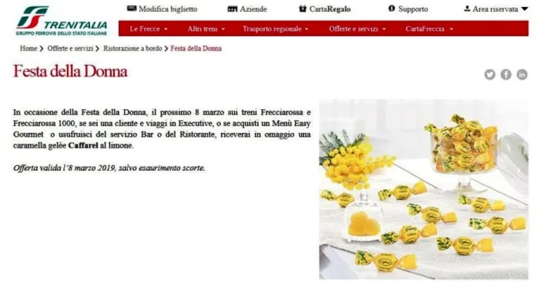 Facendo una classifica dei modi più inopportuni per celebrare le donne di sicuro il primo posto, quello del campione mondiale, spetta all’iniziativa di Trenitalia. Che riesce a vincere anche il trofeo dell’omaggio più micragnoso dell’universo con la sua caramella al limone donata a tutte le clienti che viaggiano in Executive e ordinano un menu gourmet (immaginiamo quindi viaggiatrici danarose e non misere trasfertiste). La cosa più bella di questa geniale pensata è data dai commenti degli utenti: ne consiglio la lettura in momenti di depressione marzolina.