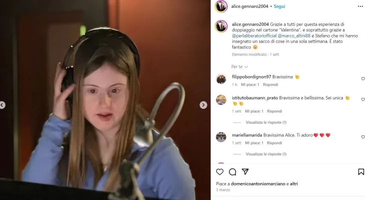 Si chiama Alice Gennaro, ha 20 anni e frequenta l'ultimo anno di superiori. Sta studiando per diventare grafica pubblicitaria. Ma la cosa straordinaria di questa giovane donna è che è diventata la prima doppiatrice con sindrome di Down in Italia. Alice ha tantissimi talenti e una enorme voglia di sperimentare. Ha frequentato danza contemporanea e nuoto. Oggi la sua voce è quella della protagonista del film spagnolo "Valentina", vincitore nel 2022 del premio Goya come miglior film d'animazione e la cui protagonista ha la sindrome di Down.