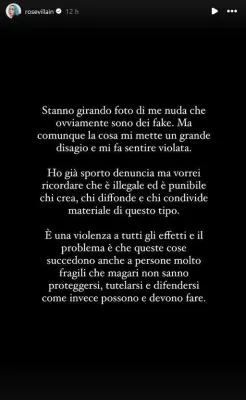 "Stanno girando foto di me nuda che ovviamente sono dei fake. Ma comunque la cosa mi mette a disagio e mi fa sentire violata. Ho già sporto denuncia ma vorrei ricordare che è illegale ed è punibile chi crea, chi diffonde e chi condivide materiale di questo tipo". In una sua storia su Instagram (guarda la gallery) Rose Villain, nome d'arte di Rosa Luini, la cantautrice milanese di 34 anni che ha partecipato all'ultimo Festival di Sanremo, ha denunciato un fatto molto grave. In Rete sono apparse foto che la ritraggono nuda. "E' una violenza a tutti gli effetti - scrive - e il problema è che queste cose succedono anche a persone fragili che magari non sanno proteggersi, tutelarsi e difendersi come possono e devono fare".