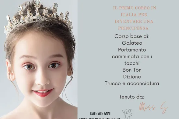Stefania Vadalà Eventi pubblicizza un corso tenuto da una misteriosissima Miss G., è la “Scuola di Principesse” sponsorizzato come “il primo in Italia per diventare una principessa”. Il corso prevede lezioni base di galateo, portamento, camminata con i tacchi, bon ton, dizione, trucco e acconciatura. Tre mesi, tre quarti d’ora a settimana. Alla fine del corso Miss G rilascerà un attestato alle neo principesse. Principesse certificate. Certo manca un dettaglio: il corso è riservato a bambine (ma anche bambini volendo, la pubblicità non lo vieta) dai 6 ai 9 anni.