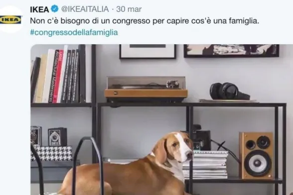 'Non c’è bisogno di un congresso per capire cos’è una famiglia'. Questo il titolo del post pubblicato dagli account Twitter e Facebook di Ikea Italia con cui l’azienda svedese spiega la propria posizione sul Congresso Mondiale delle Famiglie in corso a Verona. 'Famiglia è chi condivide il tuo divano, la tua tavola, il tuo portaspazzolino, chi usa il tuo bagno. Famiglia è chi si presenta alla tua porta senza chiamare, chi stasera cucino io', si legge nel video diventato virale in breve tempo.
