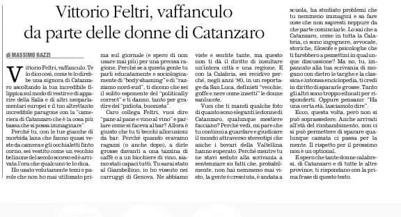 “Lo porteremo in tribunale per le sue inaccettabili offese alla nostra città e per le sue frasi razziste”, aveva enunciato il primo cittadino di Catanzaro, seguito a ruota da Razzi che ha risposto con un editoriale che già dal titolo, “Vittorio Feltri, vaffa… dalle donne di Catanzaro”, è tutto un programma. Il direttore ha poi spiegato le motivazioni dell’invettiva in un post su facebook: “Scusate se parlo di me. Da neanche tre mesi sono direttore del Quotidiano del Sud, l’unico giornale che si fa e si stampa tutto in Calabria. Oggi, per la prima volta in 40 anni, ho usato nel mio editoriale parole dirette per mandare dove secondo me merita, Vittorio Feltri. La sua battuta sulla Salis che si veste “come una cameriera di Catanzaro, che è il livello più basso possibile” è davvero insopportabile e insulta tutte le donne calabresi. Ma, se gli avessi parlato di body (o dress) shaming e di razzismo avrebbero risposto: ecco il solito appello al politically correct del solito buonista pidiota. Così ho scelto la strada più diretta e comprensibile”.