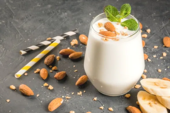 Frullate la banana con il kefir e le mandorle fino ad ottenere una crema liquida, spumosa e omogenea. Potete unire il ghiaccio e frullarlo con gli altri ingredienti oppure unirlo al drink una volta pronto. Si tratta di una ricetta gustosa e adatta a tutta la famiglia.