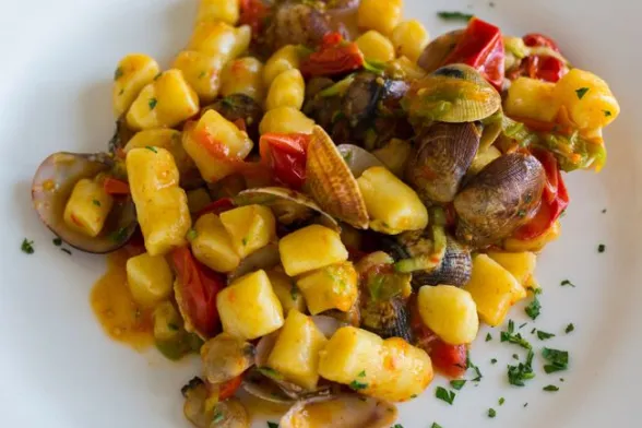 Metti a bagno nell'acqua e sale i frutti di mare per almeno 30 minuti, poi lavali accuratamente. Lava anche il pomodoro e taglialo a pezzetti. Scalda l'olio in una padella e unisci i frutti di mare, falli aprire a fuoco vivace, poi aggiungi i pomodori, aggiusta di sale e cuoci per altri 5 minuti. Cuoci gli gnocchi in abbondante acqua salata, scolali e saltali nella padella con i frutti di mare.