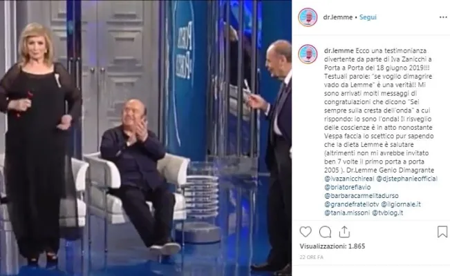 Personaggio controverso e assai criticato da esperti nutrizionisti, il farmacista Alberico Lemme continua a fare proseliti con la sua dieta “urto” che promette dimagrimenti repentini. Sono tanti i vip sedotti dal suo metodo, l’ultima dei quali è Iva Zanicchi. L’ex cantante oggi opinionista del Grande Fratello, intervenuta a Porta a Porta nella puntata del 18 giugno dedicata all’alimentazione, ha raccontato del suo rapporto con la buona cucina e dei suoi più recenti tentativi di dimagrire. Il regime alimentare scelto è proprio quello del dottor Lemme che le ha dato buoni risultati.