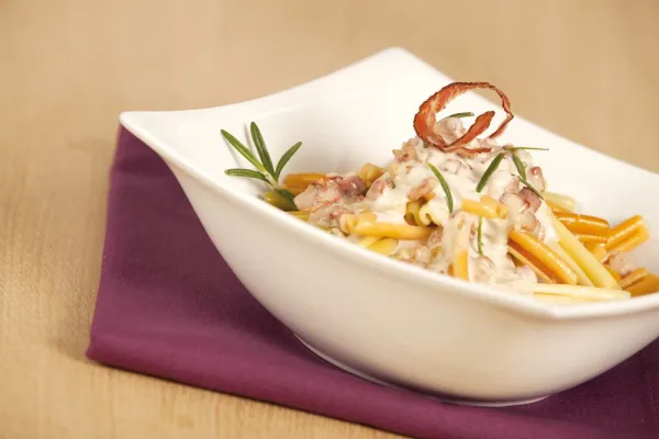Tra le ricette come primo piatto la Sandro Vanini suggerisce la pasta tricolore con castagne e speck. Ingredienti per 4 persone: 4 cucchiaini di pesto di castagne, 400 g di pasta tricolore, 1 cucchiaio di olio d’oliva, 200 g di speck a dadini, 400 g di mascarpone e 1 dl di latte. “Cuocere la pasta in acqua salata” spiega. “Scaldare l’olio d’oliva, aggiungervi i dadini di speck e farli rosolare. Aggiungere il mascarpone ed amalgamarvi il pesto di castagne. Regolare di sale e di pepe. Aggiungere il latte e portare ad ebollizione. Condire la pasta con la salsa, mescolare e servire”.
