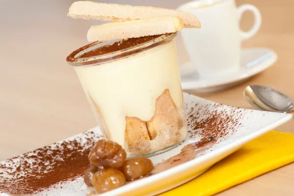 Un tiramisù originale è quello con castagne, in realtà marroni, al cognac. Ingredienti per 4 persone: 8 castagne al cognac, 2 uova, 3 cucchiai di zucchero, 100 g di savoiardi, 1 tazzina di caffè espresso, 250 g di mascarpone e 3 cucchiai di cacao in polvere. “Separare i tuorli dagli albumi” spiega la Sandro Vanini. “Lavorare i tuorli con lo zucchero fino a ottenere un composto chiaro. Montare gli albumi a neve ben ferma e incorporarli alla massa dei tuorli. Spezzettare i savoiardi, suddividerli in 4 bicchieri e bagnarli con il caffè espresso. Dividere i marroni a metà e distribuirli nei bicchieri. Incorporare il mascarpone poco alla volta al composto delle uova e riempire i bicchieri. Riporre il tiramisù in frigorifero per 5 ore circa. Prima di servire cospargere con il cacao in polvere”.