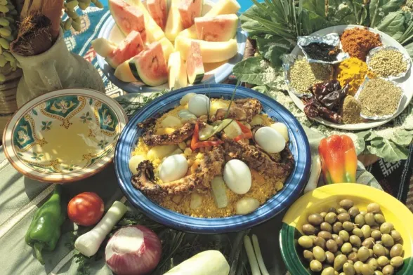 “Se vi accomodate a tavola in un antico palazzo o fondouk (caravanserraglio) trasformato in ristorante, gusterete il meglio della gastronomia tunisina. Ad esempio, il couscous alla cernia, alla mela cotogna e boccioli di rosa; il piatto di legumi farciti fondouk el ghalla; l’agnello agrodolce cotto a fuoco lento con prugne e mandorle marqa h’loua’. Come dessert gusterete la crema ai pistacchi bouza o la pasticceria profumata all’acqua di rose.