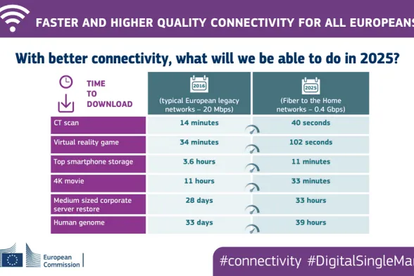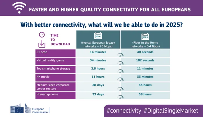 La corsa verso la Gigabit Society è sostenuta anche in sede europea dove il 14 settembre 2016, nell’accogliere la sua strategia per il mercato unico digitale, la Commissione Juncker ha adottato, con scenario al 2025, iniziative e proposte legislative per porre l’Unione Europea in prima linea nella connettività Internet.