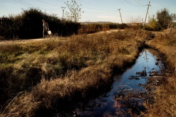 Kuçovë, un luogo spettrale, con i pozzi di petrolio, molti degli anni ‘60, “nel centro della città” e le coltivazioni “irrigate da canali di acqua nera”, con l’aria tutt’intorno “estremamente inquinata” che “profuma di gas e petrolio greggio”. I suoi pozzi petroliferi, che fanno parte del “più grande giacimento petrolifero onshore in Albania e uno dei più grandi in Europa”, furono acquisiti nel 2008 dalla compagnia canadese Bankers Petroleum, nel 2016 passata alla cinese Geo-Jade Petroleum, con la prima, ricordano gli autori del documentario, condannata dal governo albanese per “evasione fiscale” e indagata per “eruzioni legate alle esplorazioni di scisto in un villaggio vicino”.
