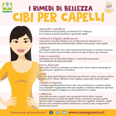 La bellezza e la cura dei capelli passa anche dall’alimentazione come sintetizza, ad esempio, un’infografica della Fondazione Campagna Amica di Coldiretti basata su una nota dei nutrizionisti Giorgio Calabrese e Caterina Calabrese. Sgombri e sardine, verdure a foglie verde scuro, legumi, noci e nocciole, carni bianche, uova, cereali integrali, latticini, ciascuno di questi alimenti contiene, infatti, nutrienti importanti per la bellezza e la salute dei capelli.