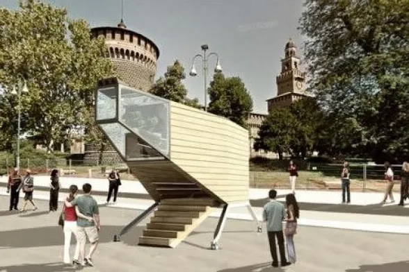 È un’astronave di legno, con portellone-rampa e piedi metallici, e verrà esposta dal 17 al 22 aprile a Piazza Castello, a Milano, poco vicino il Castello Sforzesco.