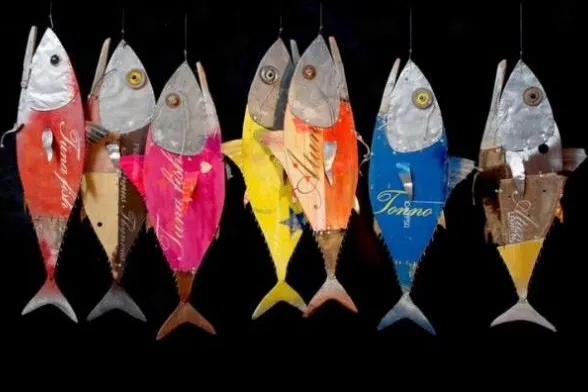 Lui è Stefano Pilato, livornese doc, classe 1975 e che ancora oggi vive in Toscana, dove lavora nell’ambito delle arti visive. Studi a Pisa all’Istituto Statale d’Arte, indirizzo Comunicazione visiva: “La mia formazione o meglio la mia inclinazione è sempre stata la grafica, ma soprattutto per la terza dimensione: il design e l’architettura…”. Nel 1987 Stefano Pilato ha intrapreso infatti la libera professione nel settore della grafica pubblicitaria, realizzando progetti per committenze pubbliche e private. Nel 1993 nasce l’idea di Pesce Fresco, la sua originalissima e sorprendente produzione artistica. Stefano Pilato inizia a raccogliere sulle “spiagge etrusche” ciò che il mare restituisce, soprattutto legno, assemblandolo con altri materiali, e costruendo, in particolare, “pesci da appendere”.