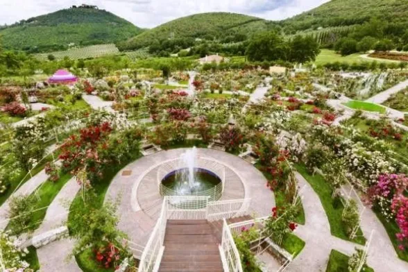 Con i suoi centotrenta settori il roseto è un vero e proprio “viaggio storico, culturale e artistico nel mondo della rosa”, con le rose raggruppate per omogeneità di sviluppo botanico, storia, colori e profumi. Fanno parte della scenografia anche alcune cancellate su cui “si arrampicano muraglie di rose”, mentre all’esterno crescono alberi sacri amanti della rosa – mandorlo, tamerice, melograno –, con il mandorlo associato alla maritata, rosa “rampicante e invasiva”, e i tamerici e melograni che compongono una siepe continua con rose “ad alta densità vegetativa”.
