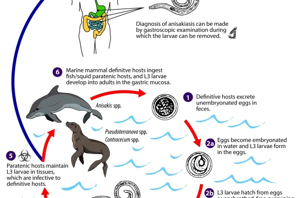 Sushi, sashimi, crudi di mare, piatti che rappresentano l’evoluzione delle abitudini alimentari che sia per moda o per non perdere le caratteristiche nutrizionali del prodotto, un consumo spesso a rischio parassitosi. Un parassita molto diffuso nei prodotti ittici d’acqua salata è l’anisakis, un nematode, verme cilindrico, che con le sue larve colonizza aringa, sgombro, tracuro, melù, tonno, pesce sciabola, calamaro, merluzzo, pesce S. Pietro, nasello, acciuga, sardina, lofidi, triglia, sugherello, totano, sparidi. Nei pesci, spiega l’Istituto Zooprofilattico Sperimentale delle Venezie, le larve possono attaccare le sierose di fegato, ovaio, stomaco, intestino, dove s’incistano a spirale. Eviscerare il pesce impedisce, viceversa, che le larve possano migrare nella muscolatura. L’eviscerazione è, infatti, importante per prevenire l’anisakidosi, causata dalle larve del nematode che attaccano la mucosa gastrica o intestinale provocando, a seconda, forti dolori addominali, blocco intestinale, nausea, vomito, febbre, ascesso, orticaria, angiodema. Parassiti possono anche attaccare i prodotti ittici d’acqua dolce, mentre le malattie d’origine alimentare possono essere causate anche da virus, batteri, sostanze chimiche.