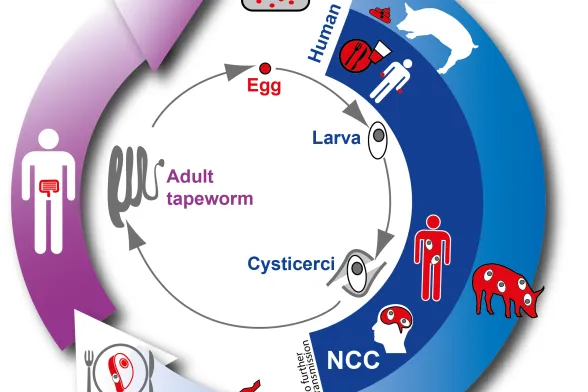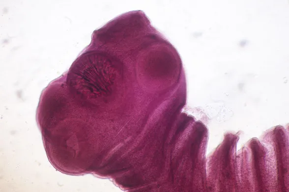 Parassita molto diffuso è la tenia. Le specie che interessano gli esseri umani sono la Taenia saginata o dei bovini, la Taenia solium o tenia del maiale, la Taenia asiatica, il Diphyllobothrium latum o tenia del pesce, la Hymenolepis nana o tenia nana. L’infezione si contrae, a seconda, mangiando carni crude o poco cotte di bovini, pesci, suini o consumando acqua e altri alimenti contaminati da feci umane, a loro volta veicolo delle uova delle tenie. Il professor Richard D. Pearson della University of Virginia ha, ad esempio, illustrato il ciclo vitale della tenia di bovini, suini, pesci: “Le tenie del maiale, dei bovini e del pesce sono grandi vermi piatti nastriformi che vivono nell’intestino e possono raggiungere fino a 4,5-9 m di lunghezza (l’uomo è considerato l’ospite definitivo perché le tenie adulte vivono nel suo intestino). I segmenti del verme che contengono le uova (proglottidi) vengono eliminati con le feci. Se gli escrementi umani non trattati vengono liberati nell’ambiente, le uova possono essere ingerite da ospiti intermedi, come suini, bovini o, nel caso della tenia del pesce, da piccoli crostacei d’acqua dolce, che vengono in seguito ingeriti dai pesci. Le uova si schiudono e liberano le larve nell’ospite intermedio. Le larve invadono la parete intestinale e vengono trasportate dal sangue ai muscoli scheletrici e ad altri tessuti, nei quali s’incistano. L’uomo acquisisce il parassita ingerendo le cisti presenti nella carne o in certi tipi di pesce d’acqua dolce crudi o poco cotti. Le cisti si schiudono e si sviluppano in vermi adulti, che si ancorano alla parete intestinale. I vermi, quindi, crescono in lunghezza e iniziano a produrre uova”.