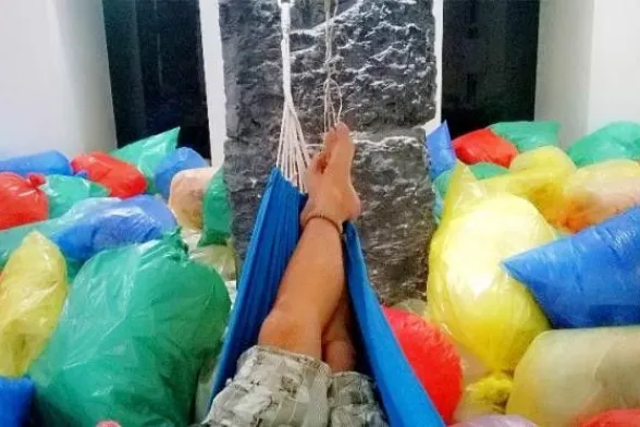 Un mare di plastica, con la Sala delle Colonne di Sala Dogana, galassia Palazzo Ducale di Genova, trasformata in un caos. Un mare dove nuotare, arrancando fra “incubi di plastica”.