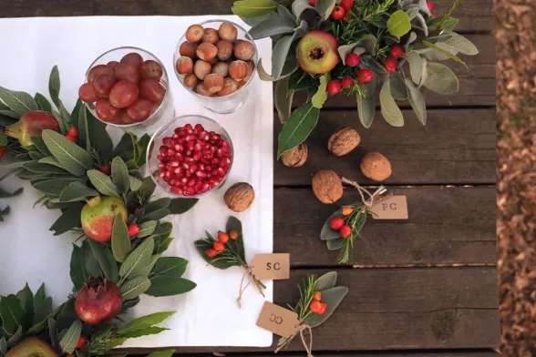 Ghirlande di melagrane e bouquet di erbe per la tavola di Natale